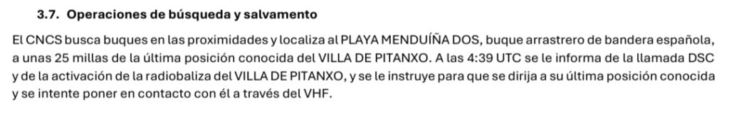 *Ningún buque no mar deu acuse de recibo ao Mayday Relay emitido pola Radio Costeira de A Coruña, ao non estaren nin á escoita na Canle 16 VHF nin na chamada selectiva dixital do GMDSS.