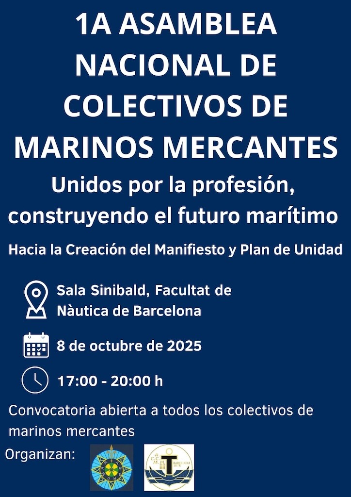 Para el próximo 8 de octubre está convocada en la Facultat de Náutica de Barcelona la reunión de la I Asamblea Nacional de Colectivos de Marina Mercante, convocados en esta ocasión bajo el lema “Unidos por la profesión, construyendo el futuro marítimo. Hacia la creación del manifiesto y plan de unidad”.