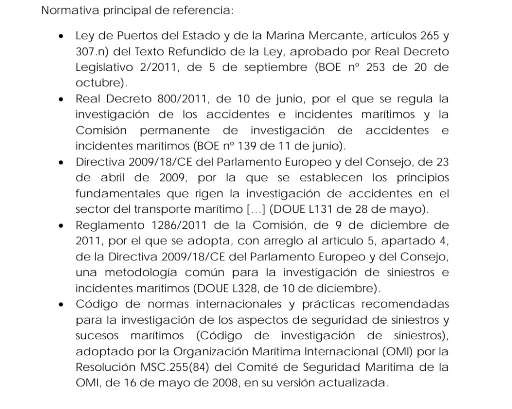 La metodología de la investigación de siniestros marítimos se recoge en el Código de Prácticas Recomendadas para la Investigación de Siniestros Marítimos/Omi y recogida en el Ordenamiento Jurídico de España como Estado Ribereño.