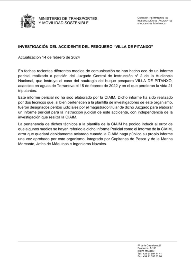 Un borrador del informe de la Comisión de Investigación de Accidentes Marítimos (CIAIM) sobre el siniestro del Villa de Pitanxo llegó a manos de la prensa cuando, aparentemente, este debía mantenerse en la confidencialidad.