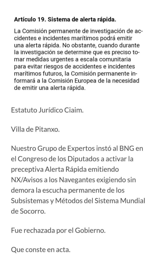 La magistrada subraya en la resolución que consta acreditado que el pesquero «había pasado satisfactoriamente todas las inspecciones reglamentarias exigidas por la normativa de aplicación y tenía todos los documentos y certificados oficiales en materia de navegabilidad y seguridad en regla». De esta forma, concluye que el Villa de Pitanxo «tenía los certificados técnicos renovados después de pasar diversas inspecciones, tanto por parte de los técnicos de la inspección marítima como de los técnicos de la sociedad de clasificación». Además, explica que el despacho y el certificado de navegabilidad o de conformidad son «los documentos a través de los cuales la autoridad pública competente garantiza que se cumplen los requisitos para que el buque resulte navegable» y que «no se reseñó incumplimiento alguno».