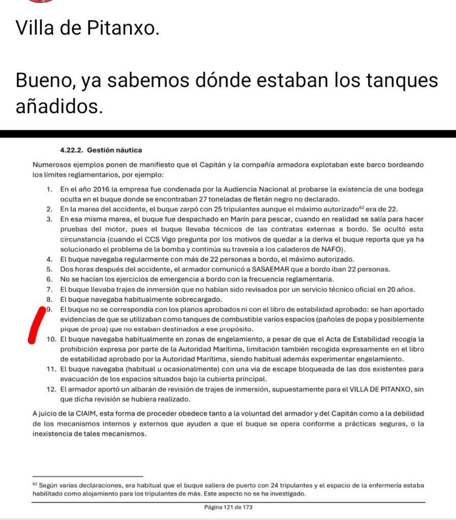 Antes de salir fue un inspector de capitanía y el barco estaba sobrecalado, a los tres dias volvió a Vigo para reparar y otro inspector de capitanía se presentó a bordo, los prácticos de Marín y Vigo en las maniobras de entrada y salida nada dijeron del sobre los calados.