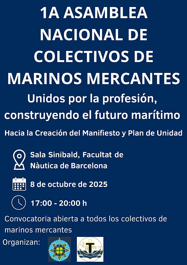 Desde el Grupo de Jóvenes de la Asociación Catalana de Capitanes de la Marina Mercante (ACCMM), nos complace invitarles a participar en la 1ª Asamblea Nacional de Colectivos de Marinos Mercantes, que tendrá lugar en: