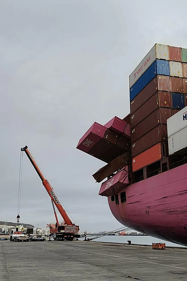 La emergencia ha obligado a su desvío al puerto de Las Palmas, donde ya se encuentra atracado en el terminal de Boluda, La Luz. Allí un grupo de trincaje especializado dentro del colectivo de los estibadores será el encargado de los trabajos para volver a estibar la carga y colocarla para que el buque pueda continuar su ruta a China. Además, será necesario soldar varias zonas de la estructura de sujeción. No obstante, la maniobra se ha pospuesto para mañana, ya que es necesario preparar un plan de seguridad que garantice que la operativa se realice sin riesgo para los estibadores y para los operarios de la terminal.
