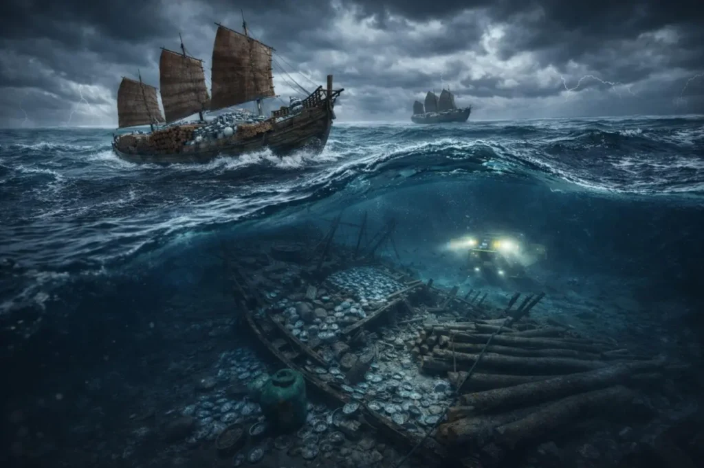 Recuperan más de 900 objetos de dos naufragios de la dinastía Ming en el fondo del mar de China Meridional. Recreación artística. Foto: ChatGPT-4o/Christian Pérez