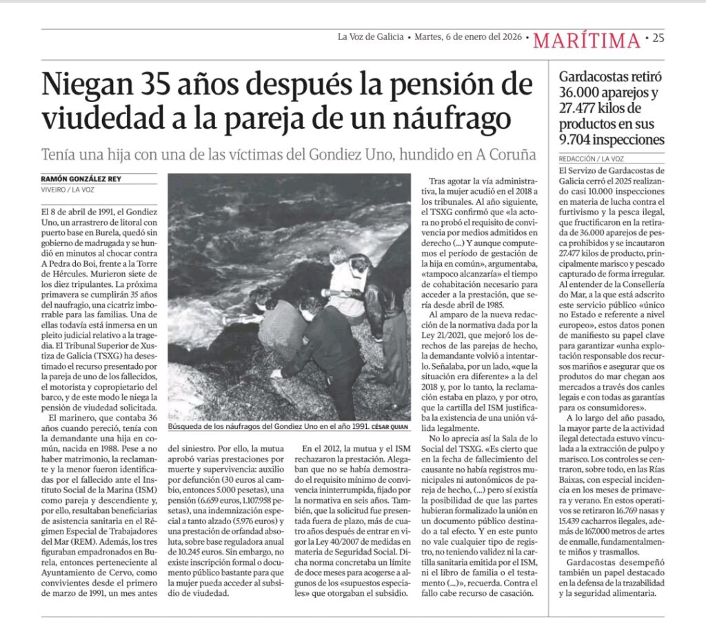 Niegan 35 años después la pensión de viudedad a la pareja de un náufrago enero 6, 2026 / admin / Sin comentarios Uncategorized Entrada anterior Boletín Emergencias Marítimas Edición 2025 Deja una respuesta Cancelar la respuestaTu dirección de correo electrónico no será publicada. Los campos obligatorios están marcados con *Comentario * Nombre * Correo electrónico * Web Guarda mi nombre, correo electrónico y web en este navegador para la próxima vez que comente. Δ