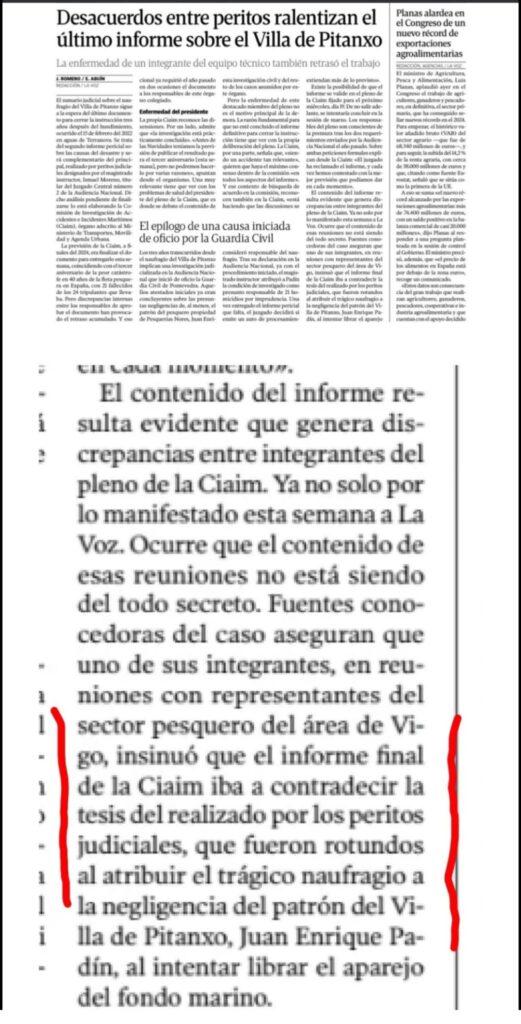 Fue el pasado mes de junio, como detalló FARO en varias entregas, cuando la Ciaim remitió a las partes su dictamen provisional. En él concluyó que la tragedia no sobrevino por un hecho fortuito: el barco de Pesquerías Nores Marín, capitaneado por Juan Enrique Padín Costas, naufragó como consecuencia de maniobras y procedimientos negligentes, tanto en el puente de mando aquella noche como desde los despachos años y meses antes.