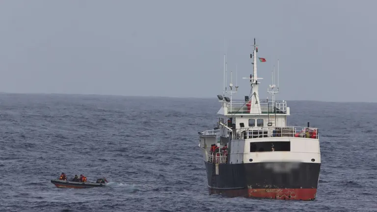 Una zódiac del patrullero Figueira da Foz transborda del pesquero que los rescató a los dos supervivientes del Carlos Cunha y el cuerpo del otro marinero. Dos pesqueros, un avión militar y el patrullero buscaron a los cuatro desaparecidos en el Carlos Cunha, que se fue a pique el 16 de diciembre a más de 200 millas al oeste de Aveiro.