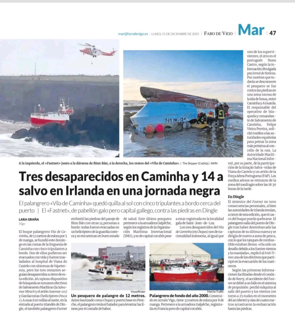 Tres desaparecidos en Caminha y 14 a salvo en Irlanda en una jornada negra diciembre 15, 2025 / admin / Sin comentarios Uncategorized Entrada anterior Buscan a tres tripulantes de un pesquero portugués que volcó en la desembocadura del Miño Deja una respuesta Cancelar la respuestaTu dirección de correo electrónico no será publicada. Los campos obligatorios están marcados con *Comentario * Nombre * Correo electrónico * Web Guarda mi nombre, correo electrónico y web en este navegador para la próxima vez que comente. Δ
