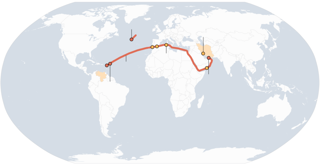 Note: Signaled locations are based on the ship’s own transponder signals. Spotted locations indicate where the tanker was physically identified in satellite imagery.