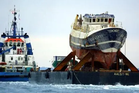 Un buque remolca el pesquero hundido «Bugaled Breizh» hasta el puerto militar francés de Brest el 13 de julio de 2004.